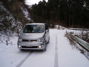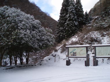 コースは水無鍾乳洞より上がる。きとく橋付近には路面は積もってなかったが、水無へ向かう林道では途中から白くなり、チェーンもしくはスタットレスじゃないと滑ってしまいそうだった。駐車場には車が一台止まっているだけで少ない。
