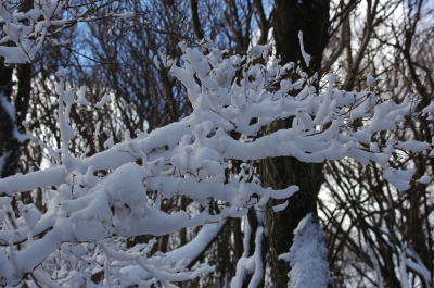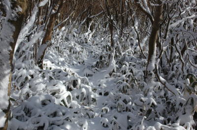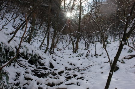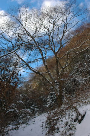雪が積もったアップダウンの縦走路、注意していたがやはり滑った。でも自然林に囲まれた縦走路や新村分岐からの下りも雪化粧は美しい。