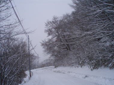 昨日から雪が降っていて峠近くから路面も木々も真っ白になっていた。